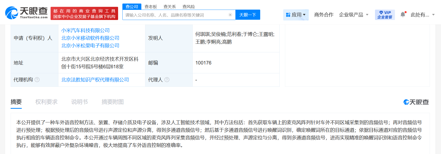 【CNMO科技消息】近日,CNMO注意到,天眼查APP信息显示,小米汽车科技有限公司携手北京小米移动软件有限公司及北京小米松果电子有限公司申请的一项名为“车外语音控制方法、装置、存储介质及电子设备”的专利正式公布。这项专利涉及人工智能技术领域,旨在提升车辆在户外复杂噪音环境下的语音识别与控制能力。