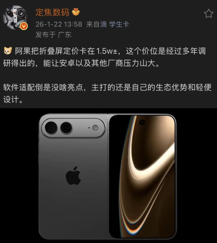 该博主表示,苹果折叠屏iPhone的定价将卡在1.5万元,这个价位是经过多年调研得出的。